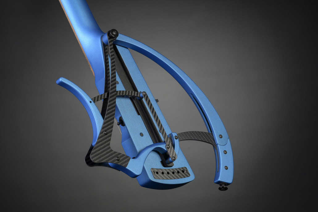 Encore plus lègère avec 1,6kg en version 6 cordes que les modèles Tourbus, son système de pliage est inspiré du modèle de basse Dragonfly permettant de la déplier en 1 seul mouvement. Une fois dépliée on retrouve les points d’appui sur le bras et la jambe pour jouer assis jambe droite ou jambe gauche. Les 2 attache courroie permettent d’y accrocher une sangle pour jouer debout.