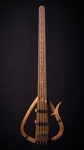 Encore plus lègère avec 1,6kg en version 6 cordes que les modèles Tourbus, son système de pliage est inspiré du modèle de basse Dragonfly permettant de la déplier en 1 seul mouvement. Une fois dépliée on retrouve les points d’appui sur le bras et la jambe pour jouer assis jambe droite ou jambe gauche. Les 2 attache courroie permettent d’y accrocher une sangle pour jouer debout.